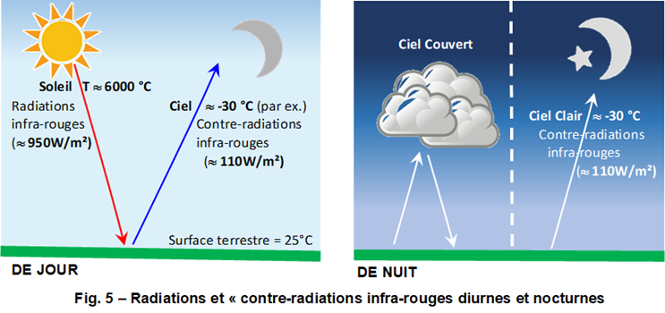 De jour, les contre-radiations infra-rouges ont pour effet de réduire quelque peu le réchauffement des surfaces - Fig. 5 Jour. Par contre, de nuit, en cas de ciel dégagé, les baisses de température résultant des contre-radiations infra-rouges ont des conséquences beaucoup plus sensibles. Ce sont toutes les surfaces exposées qui baissent de température, à l'exception des nappes d'eau - Fig. 5 Nuit.